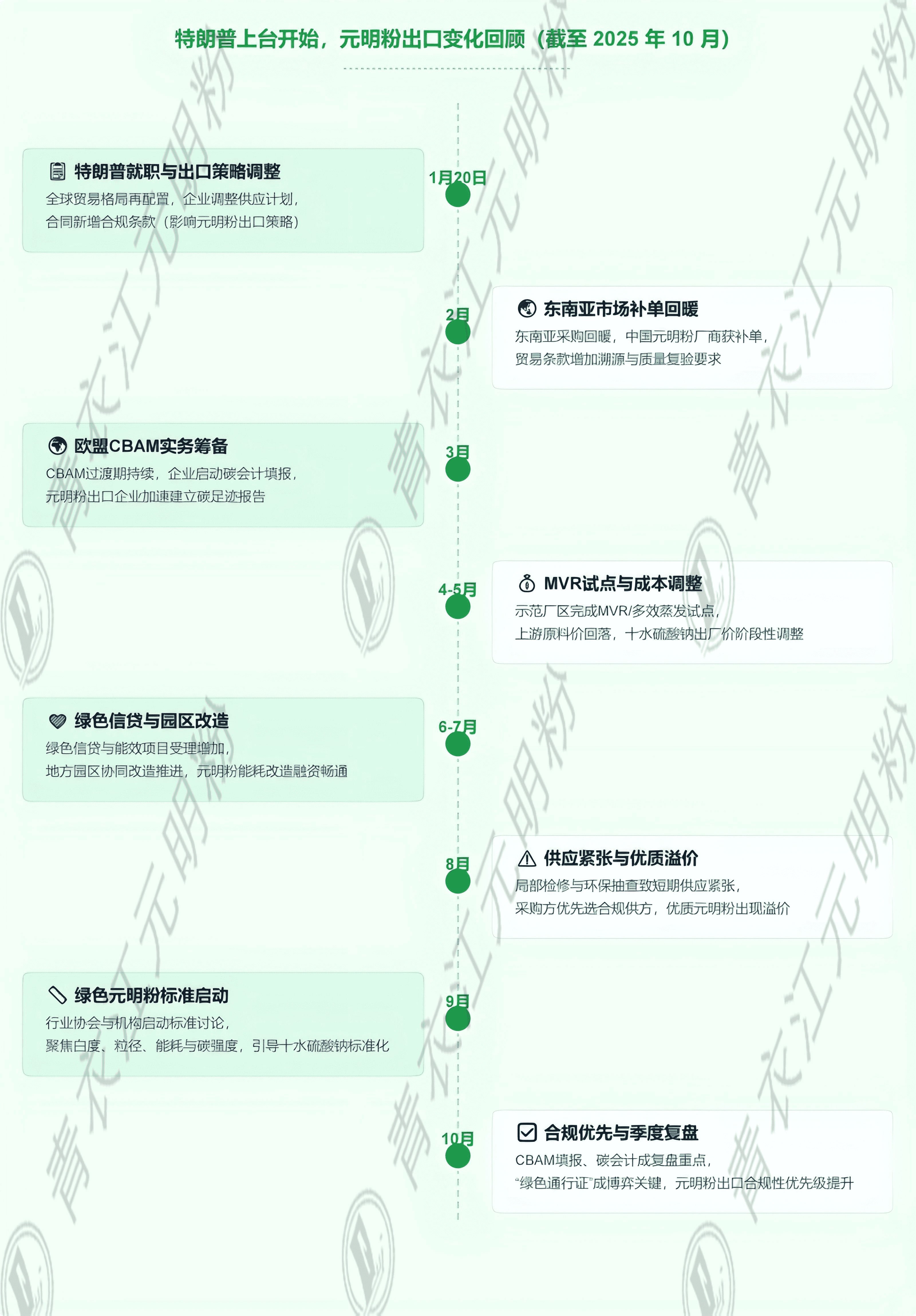 要點速覽l特朗普 2025 年就職觸發的政治預期,迅速重塑全球采購節奏,長單被拆分為短單,合同合規條款顯著增多。l歐盟 CBAM 的過渡期(3 月)把碳會計與碳足跡納入投標與長期采購條件,合規能力成為進入高標準市場的門票。l8 月檢修與環保抽查造成局